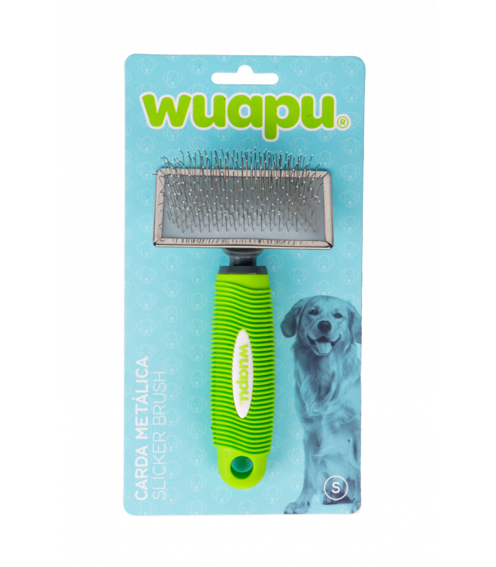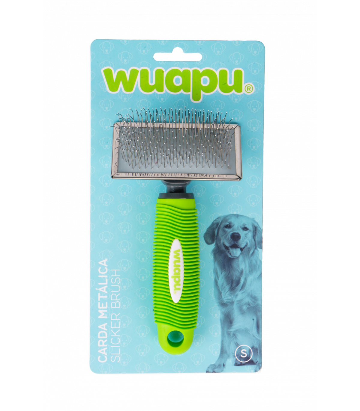 Púas inoxidables, suaves. Mango antideslizante. Las púas están protegidas y redondeadas para no irritar la piel del perro durante el cepillado.