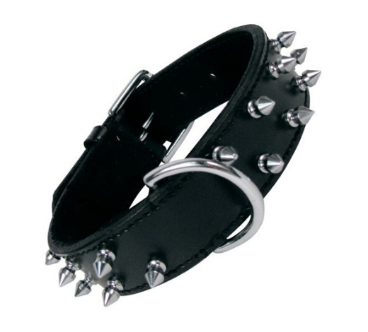 Collar de cuero negro y dos filas de pinchos metálicos de la colección de accesorios de piel Gloria. Ajustable y cómodo para el cuello de tu mascota, con piel de primera calidad.